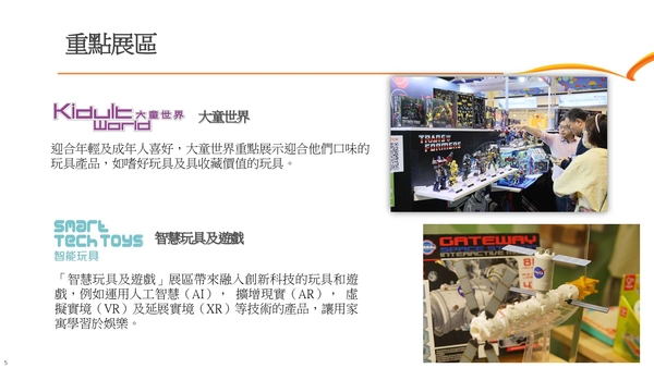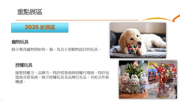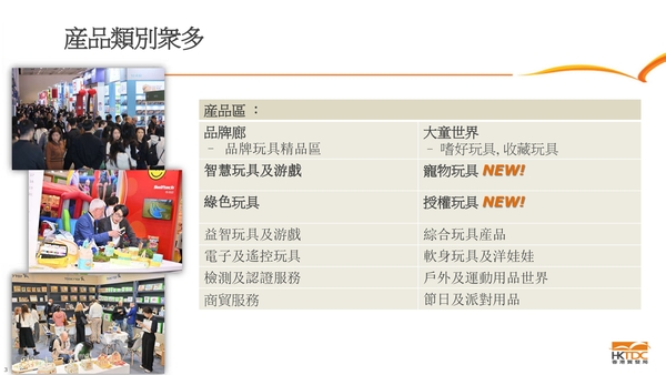 ◆品牌廊 ◆大童世界(嗜好玩具、魔術用具、模型及人偶、動作及野戰遊戲) ◆益智玩具及遊戲 ◆電子及遙控玩具 ◆綜合玩具產品 ◆戶外及運動用品 ◆節日及派對用品 ◆軟身玩具及洋娃娃 ◆智能玩具 ◆玩具汽車 ◆檢測及認證服務 ◆紙本及玩具包裝 ◆玩具授權(新增) ◆電子競技(新增) ◎同期展出: 『2026香港嬰兒用品展』及『2026香港國際文具展』 香港玩具展官網: https://event.hktdc.com/fair/hktoyfair-en/HKTDC-Hong-Kong-Toys-and-Games-Fair/