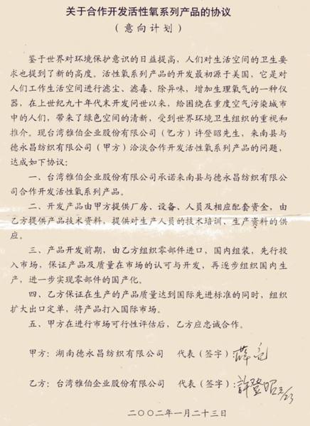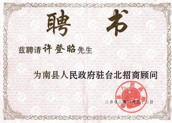 2003年往湖南南縣談空氣淨化機設廠商務後任南縣招商代表一年.
