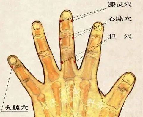 【扩展】:火膝穴、膝灵穴、心膝穴是治疗骨性、变形性关节炎的特效穴,行针之后就有效;有时候不方便下针或惧针时,用指甲缘掐按,效果亦佳。