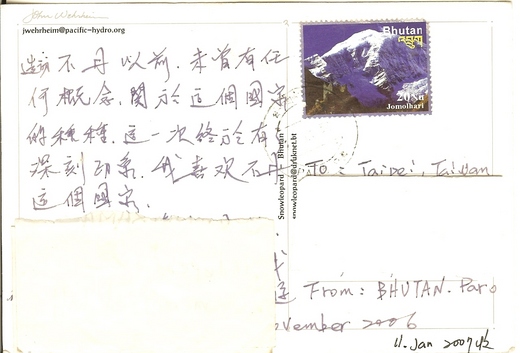 然而我在不丹的Paro所寄的明信片,卻是一張讓我望穿秋水似的等了又等,幾乎要放棄的一次期待。沒想到卻在寄信後的一個多月,才姍姍來遲的奇蹟似重現了。由此看來不丹這個國家,確實是與眾不同,還須深入去探索一番呢! (註: 第一張明信片是紐西蘭的home stay mother--Olga寄給我的信 ) . .