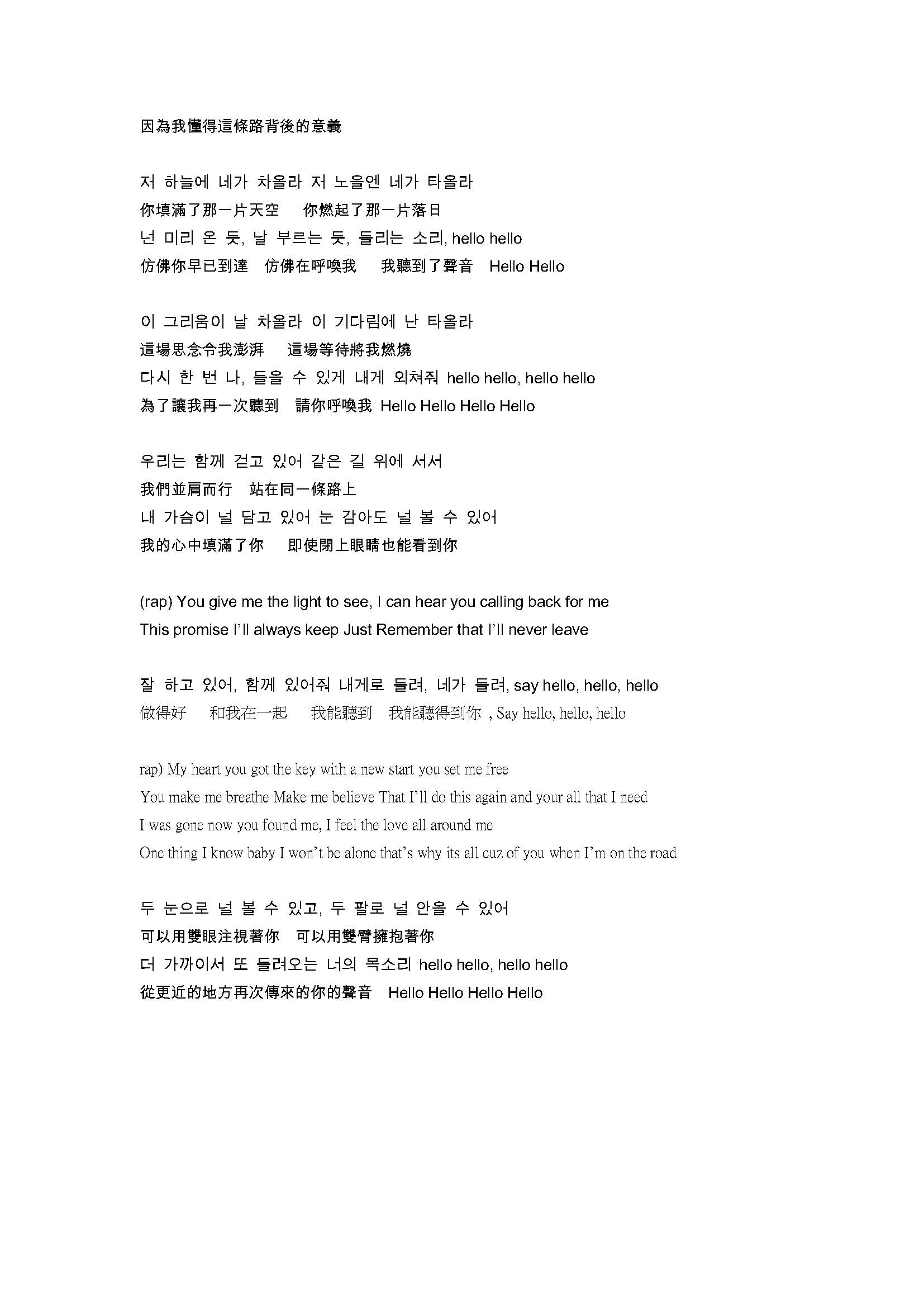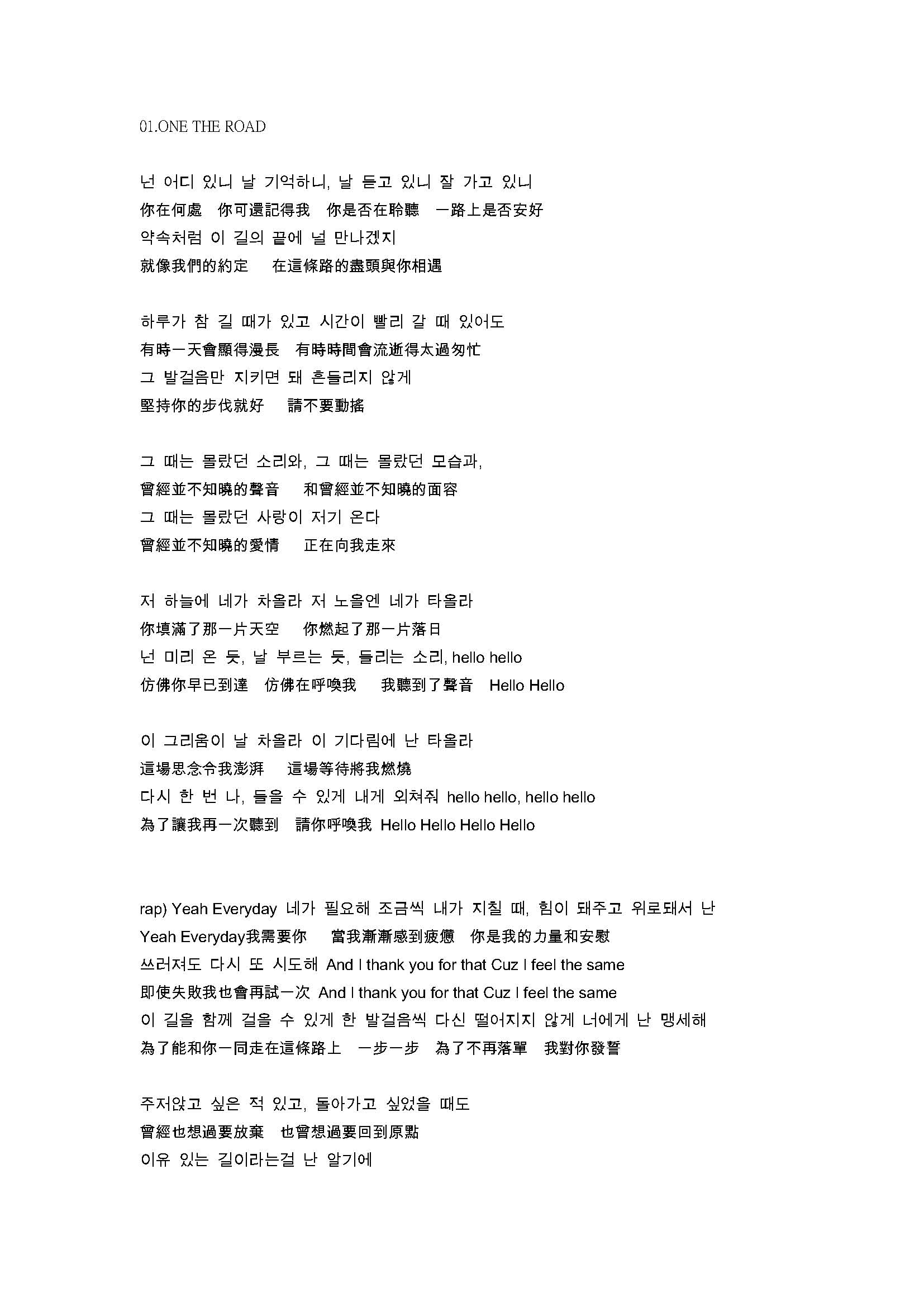 接著聽到"On the road"前奏一出來感覺篇日式編曲的風格,看著歌名就覺得有某種含意,還放在第一首這表示他的確代表著某種意義!!當四爺的聲音響起時,不爭氣地又紅了眼眶,接著二爺甜膩膩的嗓音,天ㄚ!!完全止不住淚水,你問我聽得懂泡菜文嗎??拜託,當然不懂!!但現在一看到歌詞翻譯才知道,哭完全是有道理是值得的!!音樂不停的repeat...repeat!!每首都好優喔!!話說為了最後一句HELLO是誰唱的!!都不知道聽了幾次!!原來是萬萬ㄚ~~太有感情太有層次了!!