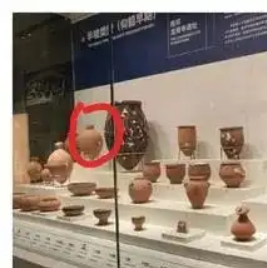 展览的照片从另一个角度能看得到这个尖底瓶的全身,只是距离稍微远了点看不太清,如下图所示,标准的一个酿酒专用尖底瓶。