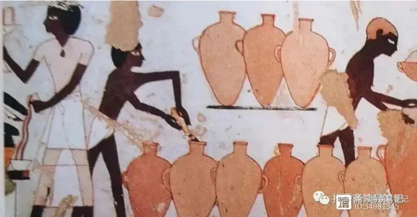 古埃及的壁画上,有一堆一模一样的尖底酒瓶。如下图所示。