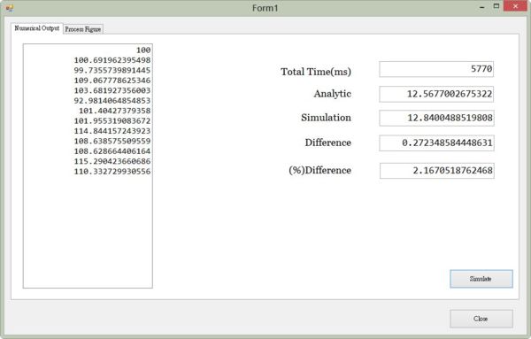 #001 namespace STBSProcess #002 { #003 public partial class Form1 : Form #004 { #005 public Form1() #006 { #007 InitializeComponent(); #008 } #009 private void button2_Click(object sender, EventArgs e) #010 { #011 Application.Exit(); #012 } #013 const int BlocksPerGrid = 256; #014 const int ThreadsPerBlock = 512; #015 static int NPath = ThreadsPerBlock * BlocksPerGrid; //131,072 Paths #016 static int MStep = 13; #017 static DateTime RefDate; #018 static List<DateTime> FixingDate; #019 static int[] h_StepGrid; #020 double[,] S = new double[NPath, MStep]; #021 double[] Value = new double[NPath]; #022 private void button3_Click(object sender, EventArgs e) #023 { #024 double Asset = 100.0; #025 double Strike = 100.0; #026 double TTM = 1.0; #027 double Sigma = 0.3; #028 double Rate = 0.04; #029 double Yield = 0.02; #030 double dt = 1.0 / 365.0; #031 // Analytic Benchmark #032 double d1 = (Math.Log(Asset / Strike) #033 + (Rate - Yield + 0.5 * Sigma * Sigma) * TTM) #034 / (Sigma * Math.Sqrt(TTM)); #035 double d2 = d1 - Sigma * Math.Sqrt(TTM); #036 double CValue = Asset * Math.Exp(-Yield * TTM) * DStat.NormDist(d1) #037 - Strike * Math.Exp(-Rate * TTM) * DStat.NormDist(d2); #038 double PValue = Strike * Math.Exp(-Rate * TTM) * DStat.NormDist(-d2) #039 - Asset * Math.Exp(-Yield * TTM) * DStat.NormDist(-d1); #040 //Random Rnd = new Random(1234); #041 MersenneTwister Rnd = new MersenneTwister(1234); #042 Stopwatch SW = new Stopwatch(); #043 RefDate = new DateTime(2014, 7, 1); #044 FixingDate = new List<DateTime>(); #045 //MStep depend on the remaining FixingDay Number, Including RefDate #046 // 0, 1, 2,..., 12, 0 for RefDate #047 for (int i = 0; i < MStep; i++) #048 { #049 FixingDate.Add(RefDate.AddMonths(i)); #050 } #051 h_StepGrid = new int[MStep]; #052 for (int i = 0; i < MStep; i++) #053 { #054 TimeSpan TS = FixingDate[i].Subtract(RefDate); #055 h_StepGrid[i] = (int)TS.TotalDays; #056 } #057 double s1, n1; #058 #059 SW.Start(); #060 for (int i = 0; i < NPath; i++) #061 { #062 s1 = Asset; #063 int diff = 0; #064 S[i, 0] = s1; #065 for (int j = 0; j < (MStep - 1); j++) #066 { #067 diff = h_StepGrid[j + 1] - h_StepGrid[j]; #068 for (int k = 0; k < diff; k++) #069 { #070 n1 = DStat.N_Inv(Rnd.NextDouble()); #071 s1 = s1 * Math.Exp(((Rate-Yield) - (Sigma*Sigma)/2.0) * dt #072 + (Sigma * Math.Sqrt(dt) * n1)); #073 } #074 S[i, j + 1] = s1; #075 } #076 Value[i] = Math.Max(s1 - Strike, 0); #077 } #078 double sum = 0.0; #079 for (int i = 0; i < NPath; i++) #080 { #081 sum = sum + Value[i]; #082 } #083 sum = (sum / NPath) * Math.Exp(-(Rate - Yield) * TTM); #084 SW.Stop(); #085 #086 double gap = sum - CValue; #087 double ratio = (gap / CValue) * 100.0; #088 textBox1.Text = SW.ElapsedMilliseconds.ToString(); #089 textBox2.Text = CValue.ToString(); #090 textBox3.Text = sum.ToString(); #091 textBox4.Text = gap.ToString(); #092 textBox5.Text = ratio.ToString(); #093 listBox1.Items.Clear(); #094 for (int j = 0; j < MStep; j++) #095 { #096 listBox1.Items.Add(S[0, j].ToString()); #097 } #098 } #099 } #100 } 程式列表2.5