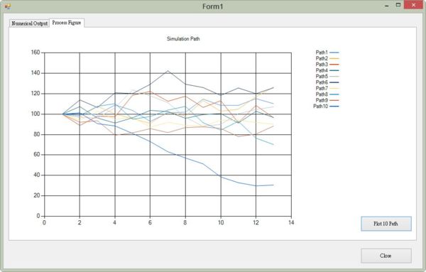 執行結果如上圖,運算時間約7.2秒,模擬值為12.8400,與解析解的理論值12.5677,誤差值為0.2723,誤差百分比約2.2%上下。我們也把前十個模擬路徑的值,作圖輸出,可以看到整個路徑上標的資產價格的變化。 |