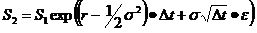 由於,(2.4.4)式是公式解,因此不論時間跨距長短,都可以直接用來模擬期末價格。實務上,十萬次的模擬是一般的要求。 (2.4.2)式的差分方程式,在給定期初資產價格S1下,可以求得期末價格S2的移轉方程式如下,