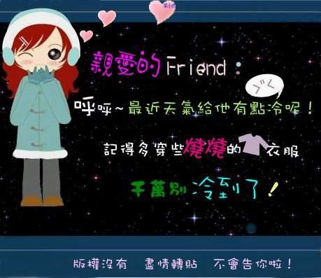 噓........... 什麼都別說 放鬆你的心情 靜靜的收下我的祝福 欣賞一下我的鋼琴演奏 雖然 彈奏的有點生澀 但是 祝福您的心意不會變 在這秋盡冬來的季節 早晚溫差大 小心保暖別著涼 Anita真誠的為朋友們捎來問候和關心 再把最深的祝福 獻給所有愛我.我愛的朋友們.....