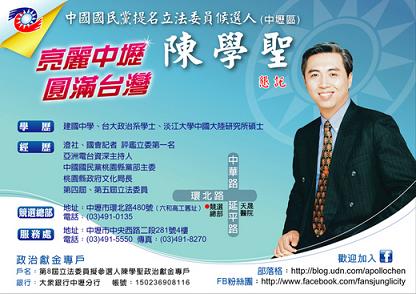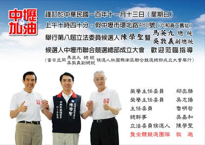 這次我個人的競選總部併同馬英九總統/吳敦義副總統候選人中壢市聯合競選總部一起成立,歡迎您之後有空到總部坐坐。謝謝!陳學聖