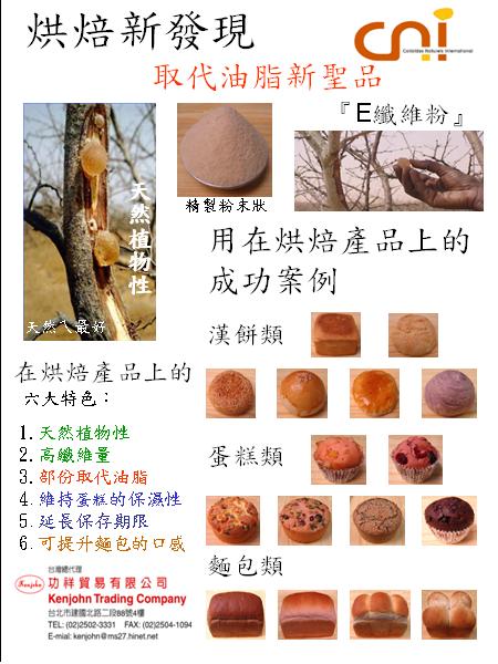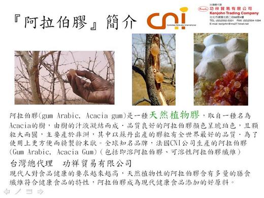 阿拉伯膠(gum Arabic, Acacia gum)是一種天然植物膠,取自一種名為Acacia的樹,由樹的汁液凝結而成.品質良好的阿拉伯膠顏色呈琥珀色,且顆粒大而圓,主要產於非洲,其中以蘇丹出產的膠粒有全世界最好的品質.目前也有經過精製過程而得的粉末狀阿拉伯膠,為了在實際使用上更方便。 『阿拉伯膠』之功能性及其應用: 1. 乳化(Emulsion)特性: 具優質的乳化特性,可應用於食品油溶性香精乳化處理,及其 他油溶性素材之乳化處理;相關應用於糖果餅乾製造業者。 2. 包覆(Encapsulation)特性: 具優質的包覆特性(如抗氧化),冷水可溶及低粘稠性,可應用於香料、果汁、酵母多元不飽和脂肪酸之相關包覆加工處理。 添加於果汁(建議用量:0.5% --- 1%)等酸性飲料,可減少酸澀感,以增加整體口感。 3. 凝膠(Gelling)特性: 具優質的凝膠特性(建議用量:25%以上,若添加40% --- 45%時, 則具高凝膠性);可廣泛應用於糖果,錠劑等製品,除具凝膠特性外,亦有抗結晶,及促進組織均勻化之效果。 4. 營養(Nutrition)(可溶性纖維)特性: 具優質的營養特性,是純天然低熱量之可溶性纖維,可添加於無 糖之糖果製品,果汁酸性飲料等,以提供優質可溶性纖維的來源。 (建議用量:1% --- 2%,視產品營養標示訴求,再酌加調整!) 功祥貿易有限公司 台北市建國北路二段88號4樓 TEL: 02-2502-3331 FAX: 02-2504-1094 E-mail: kenjohn@ms27.hinet.net