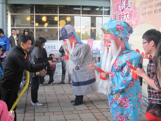 桃園縣客家文化會館1月7日下午舉行「伯公人偶」與遊客舉行猜拳PK賽,吸引遊客上門帶動農曆春節的熱鬧與節慶氣氛。 桃園縣客家文化會館在農曆春節舉行一系列春節民俗活動,其中包括客家擂茶DIY教學,同時也有特技街頭藝人表演,更有可愛的伯公人偶與遊客互動拍照。 伯公人偶與遊客舉行PK猜拳賽,遊客贏了即送紅包(內有金幣巧克力)。會館廣場市集攤位有童玩教學、客家美食、客家大湯圓等,成為超級好玩的客家文化體驗區。 |