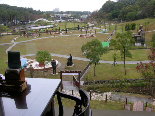 桃園縣大溪鎮慈湖兩蔣文化園區旁的一家景觀餐廳近日開幕,業者看準陸客來台的龐大商機,斥資120萬元,聘請木雕師傅打造兩尊雕像,一尊是蔣中正,另一尊是毛澤東,兩人並肩而座,讓許多遊客大開眼界,也成餐廳的鎮店之寶。 「蔣中正竟然和毛澤東並肩坐在一起,這兩位近代史上對立的政治家,難不成穿越時空,上演國共大融合?」其實,這是慈湖兩蔣文化園區新開的一家景觀餐廳想出來的開店噱頭。 近代史的政治家並肩而座的創新手法,也獲得許多參觀的陸客讚賞,業者謝求香又說,「這兩尊雕像已成鎮店之寶」,陸客一上門看到後都感覺很訝異,之後覺得親切感十足,不但入座消費,也詢問可否拍照留念等。 除了有國共融合的kuso創意外,餐廳還有如詩如畫的美景,坐在2樓往窗外眺望,有高山林立,也有小橋流水,讓人心曠神怡,特別是慈湖園區的銅塑像一覽無疑。 |