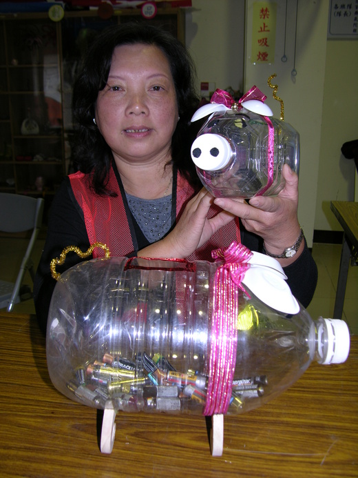 桃園縣大溪鎮月眉里銀髮學堂婆婆媽媽們,3月18日開心的在社區活動中心DIY自製「廢乾電池回收筒」,讓銀髮族動動手腦推動資源回收。 大溪鎮至善高中環保服務社學生也參與「廢乾電池回收筒製作教學與環境保護宣導活動」,現場舉辦二手物交換與跳蚤市場,並協助打掃月眉里社區環境衛生,鼓勵大家一起重視環保,讓廢棄物再生利用。 大溪鎮公所清潔隊員莊絢晴熱忱指導在場婆婆媽媽們,如何剪裁保特瓶。環保志工媽媽林秀蘭甚至創新構想,把廢乾電池回收筒變成更可愛的大小豬公造型,吸引在場眾人矚目,證實資源回收再利用已發揮功效。 |