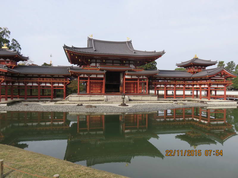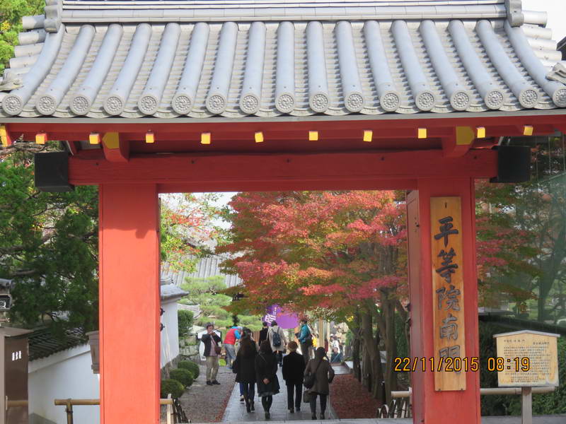 平安時代的書本《續本朝往生傳》中有「欲知極樂,當去拜宇治御寺」的記錄。 在這裏可體會日本人對於西方極樂世界的想像,即是平靜與祥和。與其他京都市的寺廟不同,這邊遊客雖然不少但不會喧鬧,可以安靜的欣賞建築及周遭的景致,我認為平等院是京都最好的寺廟,沒有太多的東西可以看,也沒有精心佈置的庭園,簡單的一間古建築物和裏面一尊大佛像,坐落在湖上。平等院的中心鳳凰堂是個既有歷史味道濃厚又氣宇非凡的建築. 周圍的水池, 樹木花草都精心設計搭配, 讓周圍每個角度觀看時都有不同賞心悅目的美感. 鳳翔館內收藏算豐富, 走一遭出來再看鳳凰堂時, 會覺得它不只是外表的美感氣勢, 更醞釀著深度歷史情感與神性在其中。 平等院楓紅僅陪襯,門前一大片紫藤,大概是5月初才開,僅一周。
