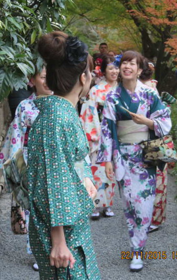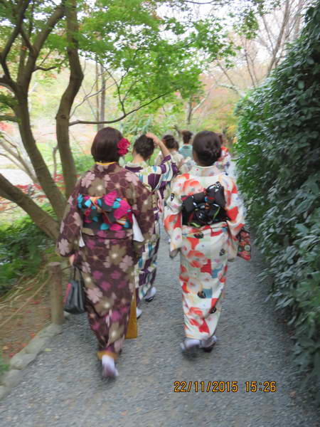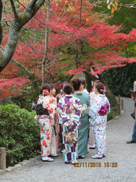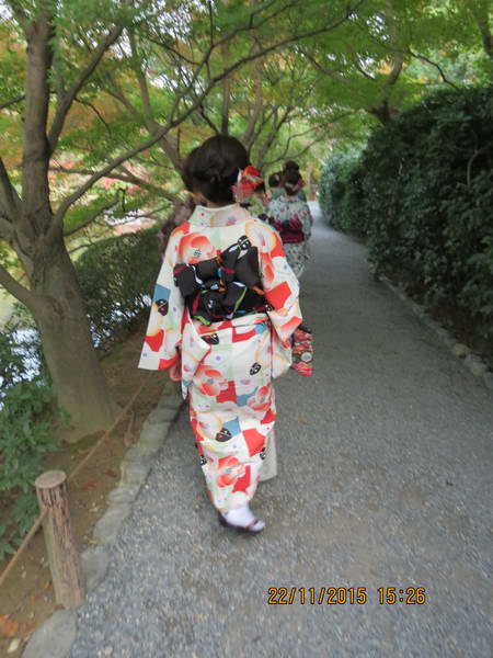 從仁和寺前到龍安寺很近,恰巧是今日參觀的第4個文化遺產,重點只有兩個:石庭與鏡溶池。到龍安寺時已近4點、感覺太陽想早點收工而鏡溶池楓紅倒影與絡繹不絕的秋遊人潮卻始終不間斷楓,葉有紅黃綠等各種顏色、層層疊疊的非常美麗。穿和服的少女三五成群在我前面嬉遊,我也一一將之入鏡。