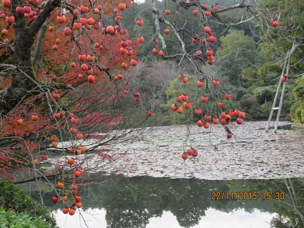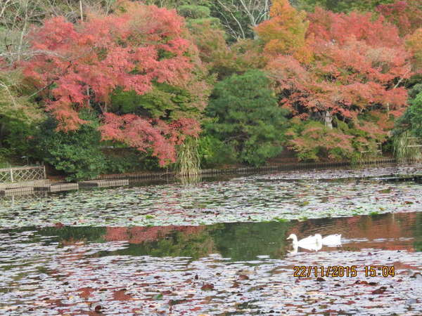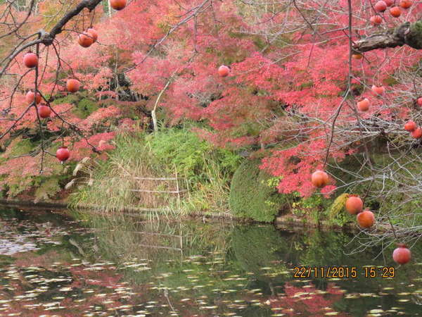 龍安寺日落時鏡溶池楓紅倒影、老鴉柿、天鵝