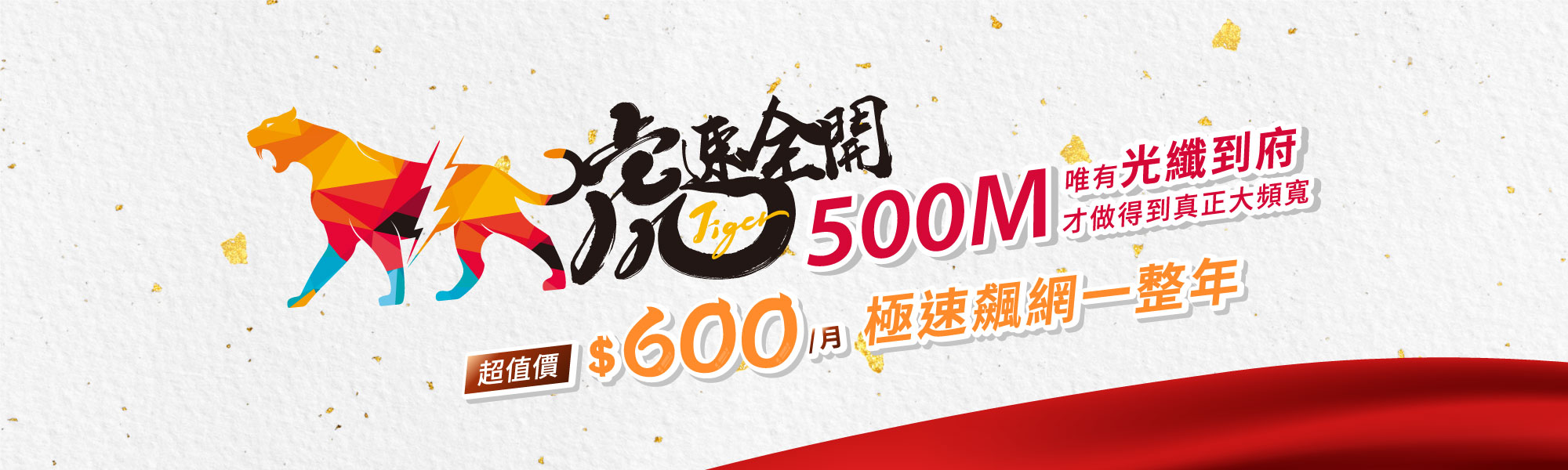為了讓消費者能以實惠的價格享受極致的上網體驗,大大寬頻釋出 CP 值爆表的「虎力全開」方案,只要每個月600 元,就能享有 500M 的下載速度!