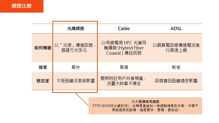 為什麼會說有些光纖網路是「半套」服務呢?雖然 FTTx 的起點都是光纖,但如果光纖的目的地並不是你家,後段透過銅纜傳輸,這樣的形式就有點像是從大水管接到大水管,傳輸的速度、穩定度就可能會受到影響;如果可以,絕對是以「全套」的 FTTH 光纖到府優先,從機房直接拉一條光纖線路到你家,中間不再經過其它設備,速度更快、更穩,也更安全。