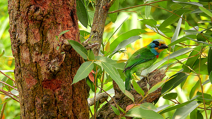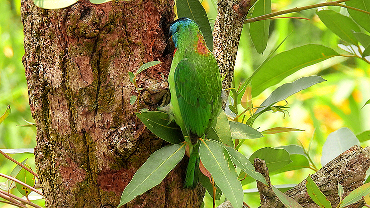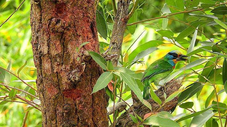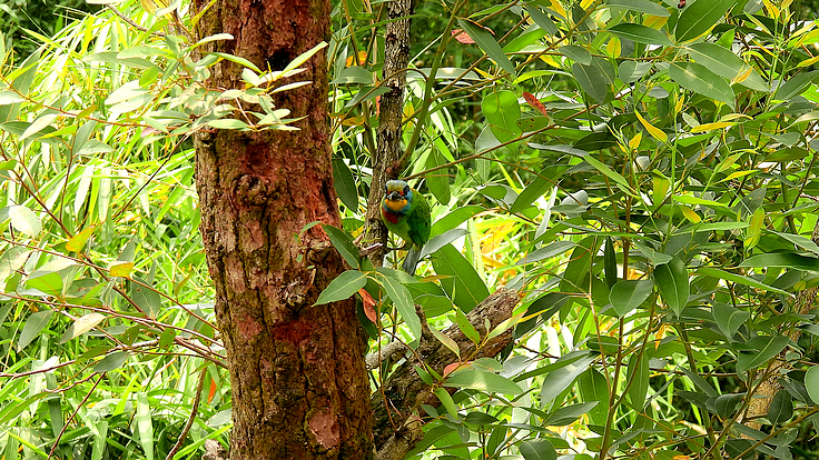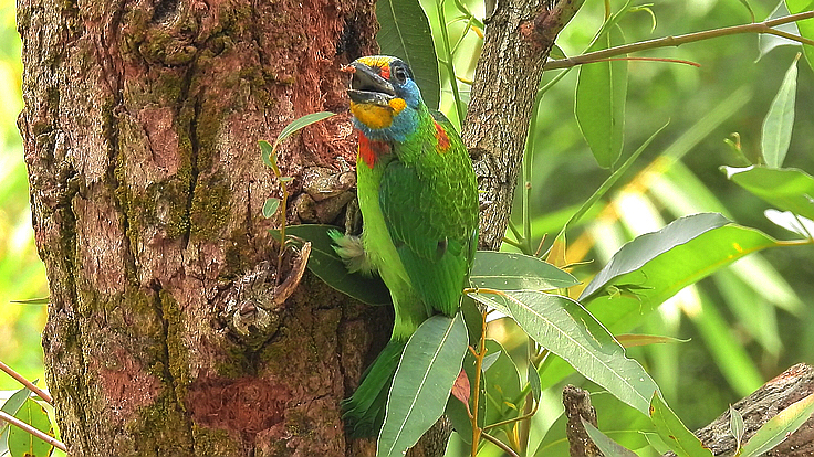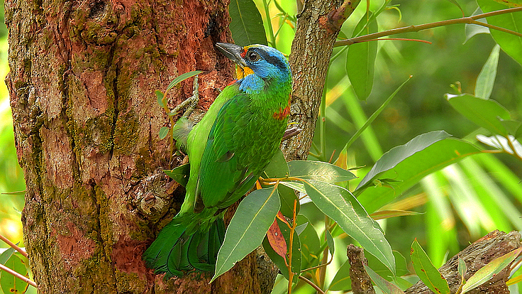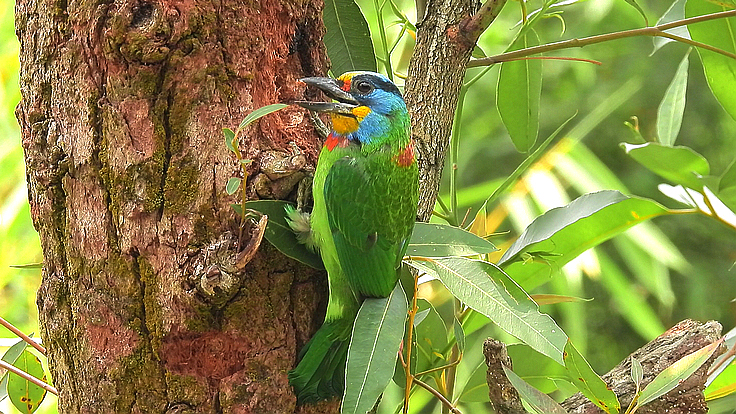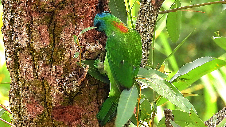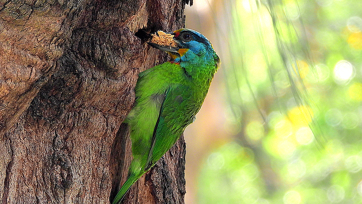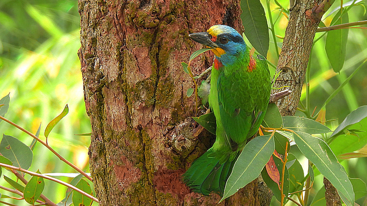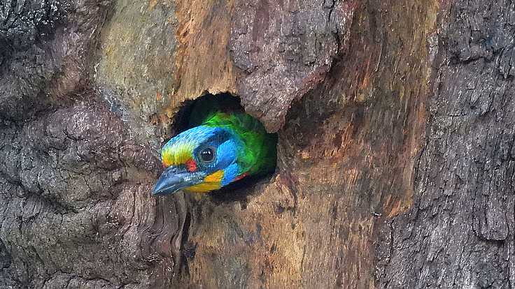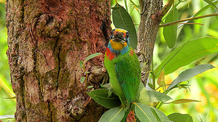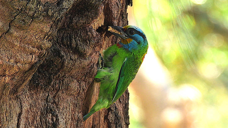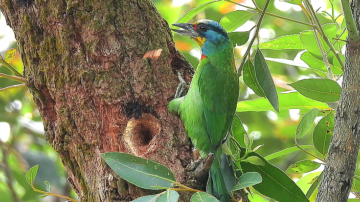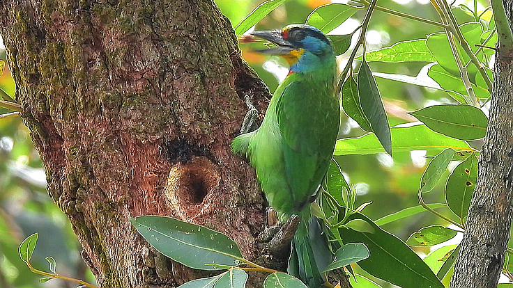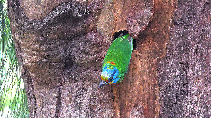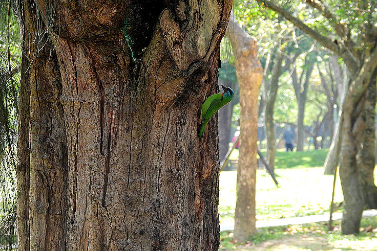 大安公園在這個育雛的季節裡,才隔幾天而已,我在不同的樹上遇見 五色鳥在鑿樹洞。 公的母的五色鳥會一起 輪流合力鑿樹洞築巢 02 04/18 找到了在鑿洞的五色鳥
