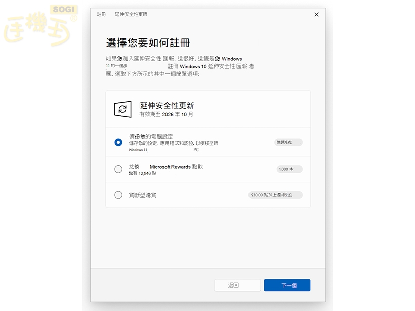 ▲根據微軟的公告,所有註冊方式只到 2026 年 10 月 13 日為止。 你必須登入 Microsoft 帳戶,才能註冊「延伸安全更新」。 當你註冊 ESU 計劃時,將會提供這些選項讓你選擇,最多可以在 10 部裝置使用現有的 ESU 授權。(圖片來源:微軟)需要注意的是,Windows 10「延伸安全更新」僅提供 1 年延長支援,到 2026 年 10 月 13 日即結束,屆時仍須面臨升級選擇。若在 2026 年 10 月 14 日後繼續使用 Windows 10,雖然系統仍能運作,但因缺乏安全更新,將增加資安風險,因此用戶應及早規劃後續方案。 關注手機王,快速掌握 Windows 軟體更新想要第一時間掌握最新手機情報與優惠資訊嗎?趕快加入《SOGI 手機王》Facebook 專區「悄悄跟你說新手機情報!」與「撿便宜!最新手機空機價格情報」,帶你即時掌握最新手機發表動態與空機價格優惠,不錯過任何手機好康!另外,你也可以透過《SOGI 手機王》的 Google 新聞與 LINE TODAY 頻道,隨時追蹤最新資訊,一手掌握 Windows 軟體更新。 Sponsor