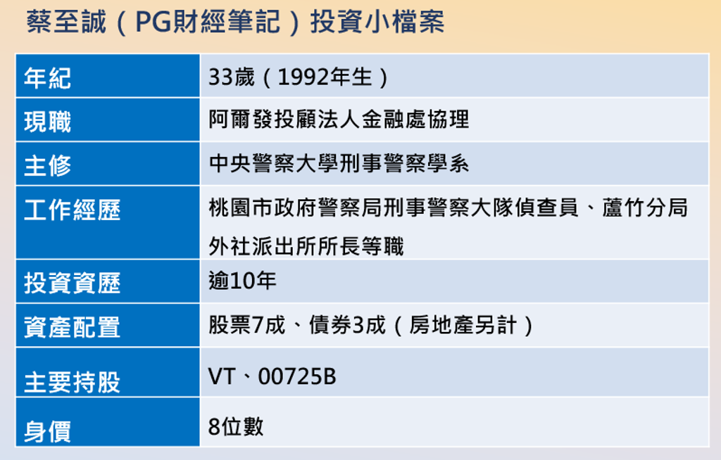 曾穿了5年的警察制服,暢銷理財書作家、阿爾發投顧協理蔡至誠表示,自己的投資很單純,只重押VT、00725B(國泰投資級公司債)等2檔ETF;至於台股ETF部分,則認為0050(元大台灣50)勝過006208(富邦台50),高股息以00940(元大台灣價值高息)最不推。
