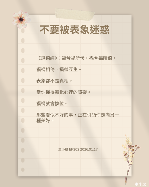 EP302 不要被表象迷惑 在《道德經》中,有兩句極具張力的話:「禍兮,福之所倚;福兮,禍之所伏」以及「損之而益,益之而損」。這不僅是古人的哲學辯證,更是我們面對現代焦慮與生活困境時,最重要的一帖定心劑。 第一,別被眼前的「現象」障礙了你的心 當我們遇到挫折、失業、感情失意或病痛時,直覺反應往往是:「老天為什麼對我不公?」但車老師要告訴你,這就是所謂的「現象障礙」。 我們總愛用短暫的片段去定義整個人生,卻忘了生命是一條長河。當下的「損」,往往是為了長遠的「益」在做鋪墊。 第二,你本自具足,轉化在於「心」 我們內在其實擁有足夠的力量去應對任何課題。關鍵在於「轉化」。如果你能突破認知的障礙,不再把困境看作「倒楣」,而是看作一場「培訓」,你就會發現,那些曾經令你不悅的經歷,最終都化成了你身上最堅硬的盔甲。 第三,那些沒經歷過的人,拿不走的智慧 為什麼有些人在困境後能脫胎換骨?因為他們學會了在不好的狀態下進行「能量轉換」。這種從低谷攀爬出來所獲得的體悟、韌性與眼界,是那些一帆風順的人永遠無法獲得的。這就是老天的「公平」之處。 如果你現在正處於你認為「不好」的狀態,請千萬不要沉溺其中。請相信,只要你願意轉動念頭,那個看似不好的東西,終有一天會在你生命中開出最美的花。 我們一起練習,在損中見益,在禍中見福。 車小斌的Instagram➡️https://www.instagram.com/p/DTm_x9TE5dl/ 車小斌的Youtube➡️https://youtube.com/shorts/4k3rW0dv1wg 車小斌的Tiktok➡️https://www.tiktok.com/@barefooter77 車小斌的落格(Blogspot.com)➡️https://gogobarefoot.blogspot.com/ 車小斌的落格2(Blogspot.com)➡️https://gogobarefoot2.blogspot.com/ 車小斌的落格(Udn.com)➡️https://blog.udn.com/barefoot/article 車小斌的軌跡與收藏 Plarail & Tomica➡️https://plarailtw.blogspot.com |