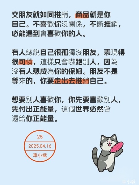 交朋友其實就跟推銷賣東西一樣,這個商品就是你自己,不喜歡你沒關係,不斷的推銷,總會遇到會喜歡你的人。 有人總說自己很孤獨沒朋友,表現得很可憐,這樣只會嚇跑別人,因為沒有人想當你的保姆。朋友不是等來的,你要走出去推銷自己。 想要別人喜歡你,你先要喜歡別人, 如果一直嫌棄別人,或是表現得可憐,用可憐博取同情,你這個商品是推銷不出去的(或者會引來怪人)。 先付出正能量,這個世界必然會還給你正能量。