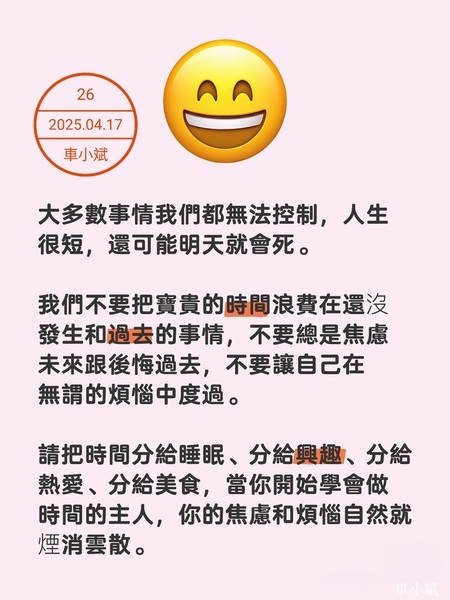 我們不要把寶貴的時間浪費在還沒發生和過去的事情,不要總是焦慮未來跟後悔過去,不要讓自己在無謂的煩惱中度過。