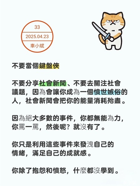 不要分享社會新聞、不要去關注社會議題,因為會讓你成為一個憤世嫉俗的人,社會新聞會把你的能量消耗殆盡。