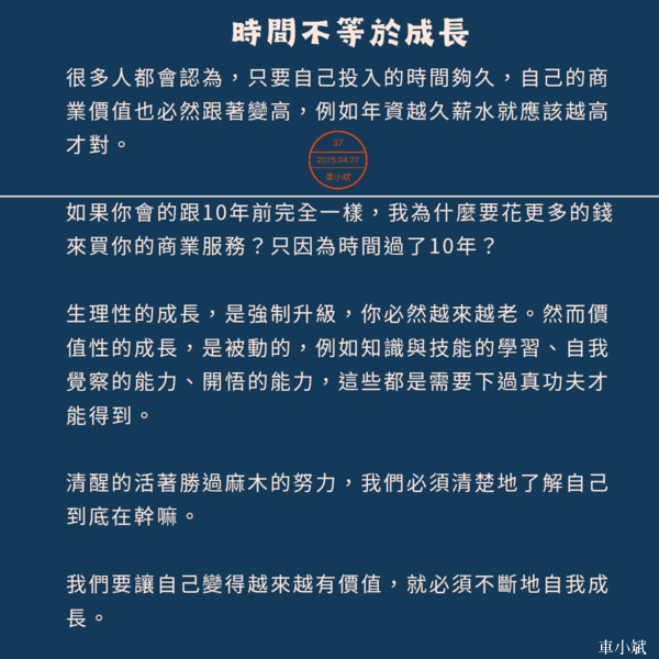 很多人都會認為,只要自己投入的時間夠久,自己的商業價值也必然跟著變高,例如年資越久薪水就應該越高才對。 如果你會的跟10年前完全一樣,我為什麼要花更多的錢來買你的商業服務?只因為時間過了10年? 生理性的成長,是強制升級,你必然越來越老。然而價值性的成長,是被動的,例如知識與技能的學習、自我覺察的能力、開悟的能力,這些都是需要下過真功夫才能得到。 清醒的活著勝過麻木的努力,我們必須清楚地了解自己到底在幹嘛。 我們要讓自己變得越來越有價值,就必須不斷地自我成長。 |