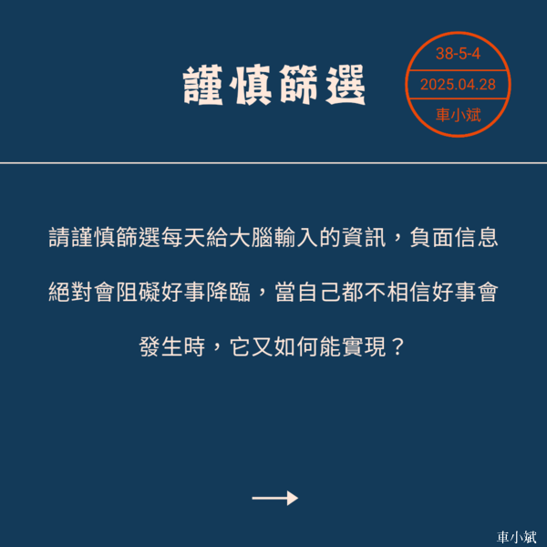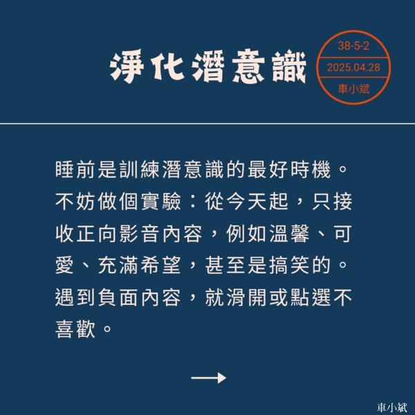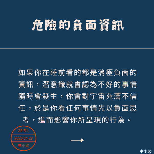 相信宇宙 心想事成 如果你在睡前看的都是消極負面的資訊,潛意識就會認為不好的事情隨時會發生,你會對宇宙充滿不信任,於是你看任何事情先以負面思考,進而影響你所呈現的行為。 睡前是訓練潛意識的最好時機,不妨做個實驗:從今天起,只接收正向影音內容,例如溫馨、可愛、充滿希望,甚至是搞笑的。遇到負面內容,就滑開或點選不喜歡。 潛意識控制著我們的大腦與行為,利用正向的信息來潛移默化自己的潛意識,讓自己的潛意識充滿真善美,好的東西就會發生在你身上,你會發現這個方法效果驚人,且難以解釋。 唯有相信宇宙是真善美的,才能真正實現心想事成。 請謹慎篩選每天給大腦輸入的資訊,負面信息絕對會阻礙好事降臨,當自己都不相信好事會發生時,它又如何能實現? 你的能量會不斷印證你的「相信」,你相信什麼,宇宙就是你相信的樣子,所以睡前不要再去看那些不好的東西了。