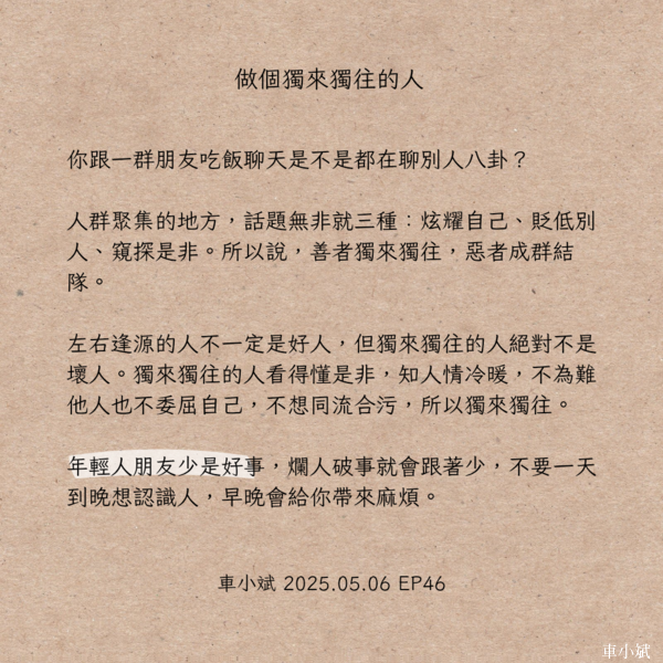 EP46 做個獨來獨往的人(朋友少是好事) 你跟一群朋友吃飯聊天是不是都在聊別人八卦? 人群聚集的地方,話題無非就三種:炫耀自己、貶低別人、窺探是非。所以說,善者獨來獨往,惡者成群結隊。 左右逢源的人不一定是好人,但獨來獨往的人絕對不是壞人。獨來獨往的人看得懂是非,知人情冷暖,不為難他人也不委屈自己,不想同流合污,所以獨來獨往。 年輕人朋友少是好事,爛人破事就會跟著少,不要一天到晚想認識人,早晚會給你帶來麻煩。 |