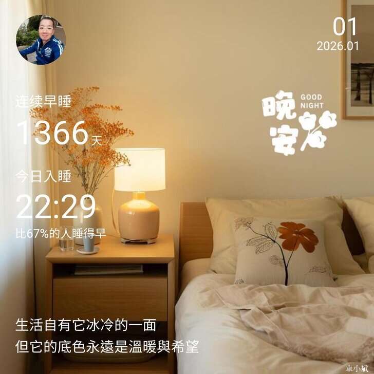 ⬆️晚安打卡圖,2026.01.01,生活自有它冰冷的一面,但它的底色永遠是溫暖與希望