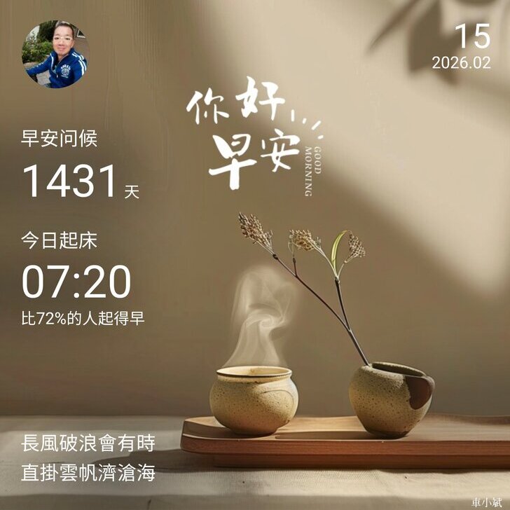⬆️早安打卡圖,2026.02.15,長風破浪會有時,直掛雲帆濟滄海 『長風破浪會有時,直掛雲帆濟滄海』出自李白《行路難》,是他最具豪情壯志的詩句之一。 「長風破浪會有時」:比喻人生雖有困境,但總有一天能乘長風、破巨浪,迎來轉機。 「直掛雲帆濟滄海」:展現詩人胸懷大志,勇敢無畏,終將揚帆遠航,跨越人生的大海。 這句詩常被用來勉勵自己或他人,提醒我們在低谷時不要失去信心,因為「破浪」的時刻終會到來。 |