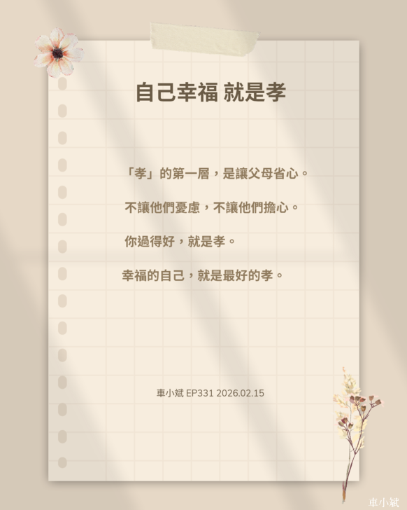 EP331 自己幸福,就是孝 很多人以為孝順就是物質上的奉養,或是陪伴在側,但其實,孝的第一層意義,是讓父母安心。 父母最怕的,不是缺少物質,而是日夜擔憂子女的生活。 當一個人不成器、不成才,甚至生活沒有方向,父母的心就會被憂慮填滿。這樣的狀態,才是真正的不孝。 所以,什麼是孝?就是讓父母不必為你操心。當你能好好過日子,努力成長,活得安穩自在,父母的心自然放下。幸福的自己,就是給父母最好的禮物。 當我們能自立自強,活出幸福,這份安穩與快樂,不僅是對自己的祝福,更是對父母最深的孝心。 |