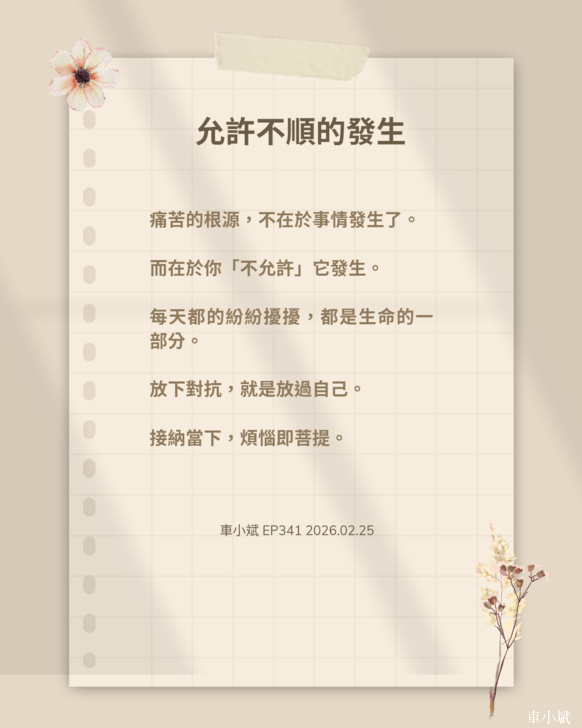 EP341 允許不順的發生 我們常常不願意接受當下的自己,或是不願意接受已經發生的事情。這種「不接納」的心態,會讓我們陷入更多的煩惱與痛苦。 出門遇上塞車,我們抱怨; 狀態不好,我們否定自己; 孩子不聽話,我們難過; 伴侶沒有關心,我們不開心。 這些情緒的背後,其實不是事件本身,而是我們心中對「不接納」的抗拒。當我們拒絕現實,就會產生對抗,而對抗只會讓痛苦加深。 接納,它讓我們能夠淡然看待一切,從容接受正在發生的事情。接納自己不完美,接納世界不完美,接納他人不完美。當我們允許一切的發生,心就能安住,煩惱自然消散。 生活中,練習接納,就是練習放下。放下對抗,放下執著,放下對「完美」的苛求。當我們真正懂得接納,才能擁抱自在與安寧。 |