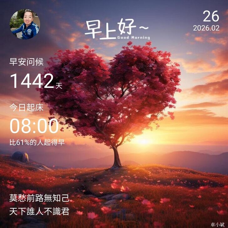 ⬆️早安打卡圖,2026.02.26,莫愁前路無知己,天下誰人不識君 「莫愁前路無知己,天下誰人不識君」出自唐代詩人高適的《別董大(其一)》。這句詩的意思是:不要擔心前方的路途上遇不到知己,因為憑你的才華和聲名,天下之人誰會不認識你呢? 這句話充滿了對友人的鼓勵與信任,彰顯出豁達的胸襟和真摯的情誼,給人以積極向上的力量。