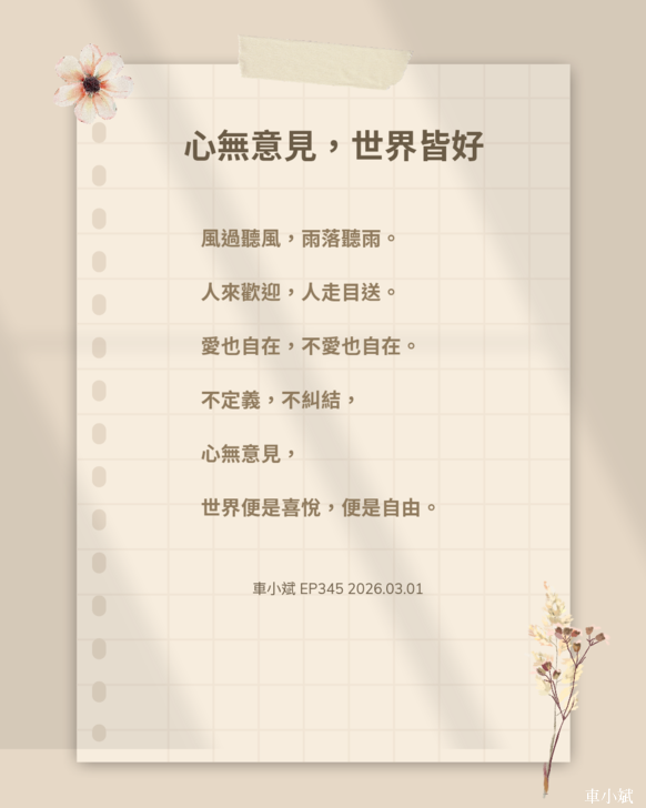 EP345 心無意見,世界皆好 在日常生活中,我們很愛為人事物下定義,貼上標籤,甚至帶著期待去看待一切。然而,當我們執著於定義與期待,失望便隨之而來。因為世間萬物,本就不是用來被定義的,而是用來順應的。 風來,就聽風;雨來,就聽雨。孩子成績好也對,成績不好也對。因為當我們放下執念,他的一切表現都只是自然的流動。你愛我也好,你不愛我也好,我都自在。你來,我歡迎你;你走,我目送你。這就是生命的本然。 當我們不再對世界有意見,不再糾結於人事物的好壞,心便安定下來。喜悅不是外在的獎賞,而是內心的狀態;自由不是逃離,而是放下。真正的自在,是不再需要定義,而是能夠順應一切。 這樣的心境,讓我們活在喜悅中,活在自由裡。 |