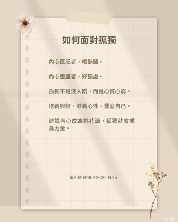 EP369 如何面對孤獨 人在內心越脆弱、越匱乏的時候,就會越喜歡熱鬧、越喜歡群聚。當一個人開始內心變得越豐盈、越強大的時候,反而習慣獨處。 孤獨跟有沒有人陪沒有關係,因為即使有人陪,我們仍可能感到孤獨:例如對方不理解你、不在意你,跟本不懂你要什麼,他就在你旁邊,你仍會覺得孤獨。這時候的孤獨,源自於內心的落差,而不是身邊是否有人。 孤獨的唯一解法,是讓內心豐盈起來。當我們開始培養興趣、提升認知、強大心性,內心逐漸豐盈,就能在獨處中找到安定與自在。孤獨便不再是痛苦,而是一種修煉,一種力量。 古人說:「獨處而不孤,乃心之豐盈。」當我們能在心中建造一個桃花源,孤獨便不再是敵人,而是陪伴我們成長的朋友。要安穩要快樂,來自內心,而不是外在有沒有人陪。 孤獨不可避免,但它能成為心靈的養分。當你內心豐盈、能自給自足,煩惱、痛苦自然消失。 |