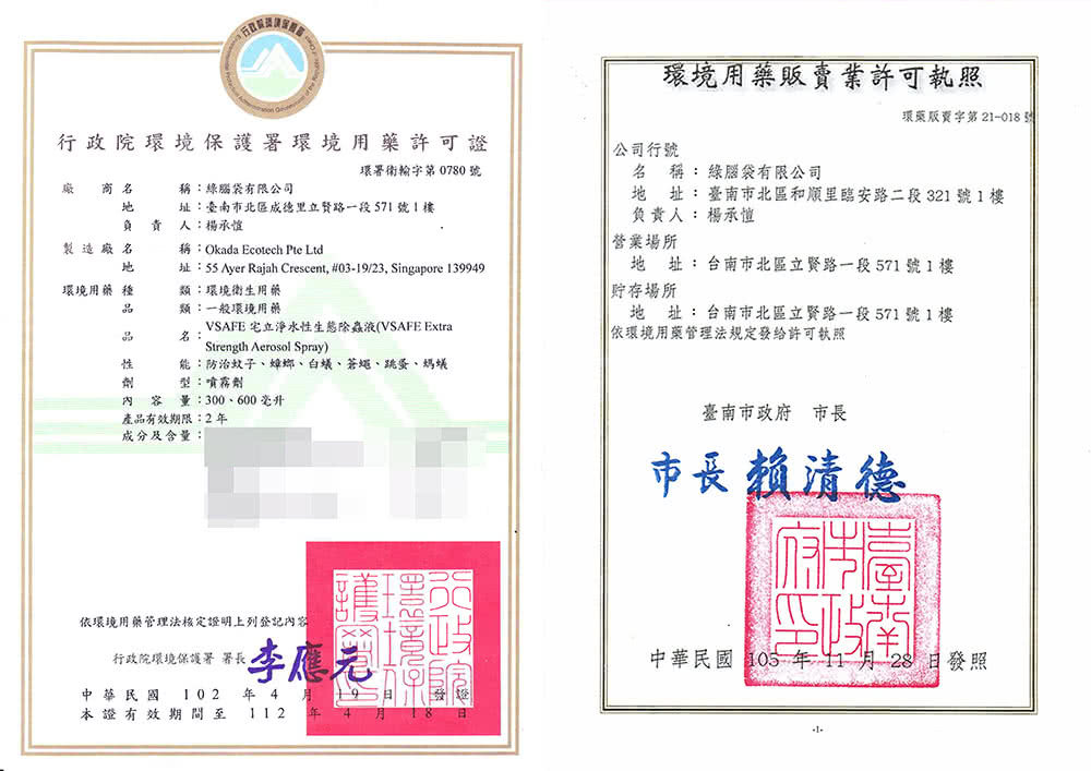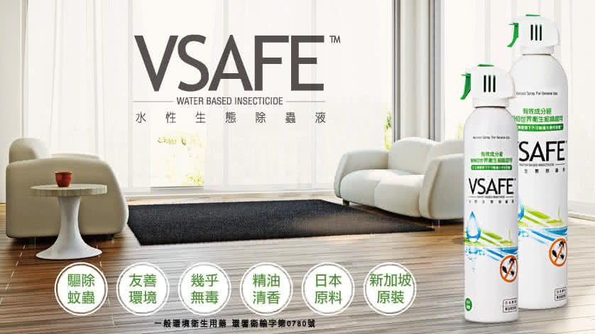 VSAFE™ 7大特色 1. 有效防治多種常見害蟲VSAFE™水性生態除蟲液,經環保署核准-環署衛輸字第0780號,可廣效防治居家常見的害蟲: 蟑螂、蚊子、蒼蠅、跳蚤、螞蟻、與白蟻,效果可持續約2週,省去您在家中堆滿各式藥劑與偏方的麻煩。 2. 有效成分經WHO世界衛生組織認可 - 對人畜毒性極低VSAFE™採用的有效成分-依芬寧(Etofenprox),原體急性毒性數據為 LD50大於42,880 ( 大鼠口服 mg/kg),對人畜毒性極低。WHO世界衛生組織殺蟲劑評估報告中(WHOPES/97.24.1),將依芬寧(Etofenprox)列為毒性最低的等級U: 「在正常使用下不可能產生急性危害」。 3. 植物精油取代有機溶劑VSAFE™不含有高危險性的有機溶劑,堅持採用高品質的松木精油調配,淡淡的松木清香不但氣味接受度高、兼具除臭功能,更被US EPA美國環保署核准為毒性分類List4B:「有足夠資料證明不影響公共衛生與環境」的殺蟲劑副成分。 4. 水溶性配方減輕環境負擔VSAFE™獨特的水溶性配方,具有生物降解與光降解特性,有效減輕藥劑對生態環境的負擔。水溶性配方噴灑後不易留漬的特性,也省去許多噴灑後清潔上的麻煩。 5. 單體鋁製氣霧罐為確保罐體免遭受到水溶性配方的腐蝕,VSAFE™有別於一般市面的鐵罐,採用單體鋁製氣霧罐(Monobloc Aluminum)充填,同時確保藥劑品質穩定與儲藏時的安全,鋁罐還有可無限次回收與不斷循環再生的優異特性。 6. 日本大廠有效成分VSAFE™的有效成分 - 依芬寧(Etofenprox)來自世界頂尖的供應商,同時也是最初發明依芬寧(Etofenprox)的日本三井化學集團,其生產之原體純度可達99.6%以上,效果非其他副廠產品可比擬。VSAFE™也是環保署核准之環境用藥中,唯一採用日本三井化學供應的依芬寧(Etofenprox)原體。 7. 新加坡技術原裝進口VSAFE™的製造商Okada Ecotech來自生技產業重鎮新加坡,專精於融合累積多年的專有化學配方及傳統天然植物提煉技術,產品堅持新加坡生產調配,原裝輸入台灣。
