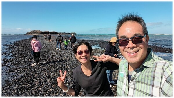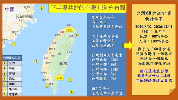 第60條古道 2025/12/01 台灣著名的「摩西分海」位於澎湖縣湖西鄉北寮村奎壁山地質公園,它是一條因潮汐漲退而形成的礫石步道。漲潮的時候,赤嶼在海面上;退潮的時候,海面分開,出現一條長約300公尺的陸地,可從沙灘走到赤嶼。 若打算探訪奎壁山摩西分海,必先上網查詢當日的潮汐變化,以免空跑一趟,望洋興嘆。例如計畫在2026/02/01探訪澎湖摩西分海步道,查詢的結果顯示:當日滿潮約在上午11點,乾潮約在下午4點半,步道開放為14:30 ~ 17:30約三小時。退潮情景最壯觀,最佳觀賞時段為滿潮後3小時至乾潮後2小時。建議提早一小時抵達,除了步道、沙灘、潮間帶,還可以探訪奎壁山地質公園。 從赤嶼回看北寮村,島嶼延伸到陸地,漲潮時,整條步道都將被海水淹沒。陸連島的自然景觀並不唯一,台東金樽也有陸連島景觀,但是漲潮海水將連接陸地都完全淹沒的分海景象,就比較稀奇了。在日本靜岡縣西伊豆町的堂之島地質公園也有類似分海景象的陸連島,為此,澎湖和西伊豆町還簽署友好交流意向書,合作推廣兩地的觀光旅遊。 奎壁山地質公園擁有獨特的火山岩脈與豐富的海洋生態,是前往澎湖不可錯過的景點。沿著環山草徑走一圈,可以在雷達站登高望遠,走到山的另一面,將會見到絕美的風景。若是時間充裕,可以下到細沙海灘走走,那就更棒了。 我們在淡季的平日來訪,餐廳和商家都沒營業,上網查到「台灣坑休閒魚場」可參觀養殖場,還可品嘗現撈的海鮮。我們點了金瓜米苔目和鮮剖海膽,可惜這時節沒有海葡萄;米苔目一級讚,海膽就沒啥驚喜。 耶~ 這是我們台灣60步道的最後一條步道了,歷時五年半,沒有任何壓力,在歲月靜好的台東旅居之餘,就這樣完成了一個環遊台灣的計畫。依照計畫,兩人攜手走了60條台灣步道,涵蓋台灣每一個縣市也包含所有的離島。除了花蓮大地震的影響,將錐麓古道改為紅石林道,達成率近乎百分百。在達成環遊世界和台灣步道計畫之後,下一步就是旅行中國了。 |