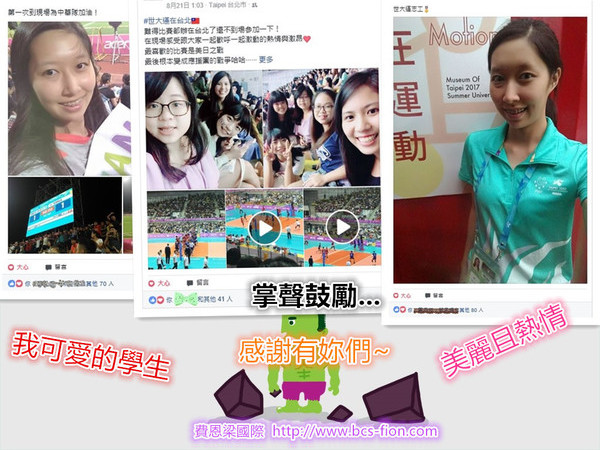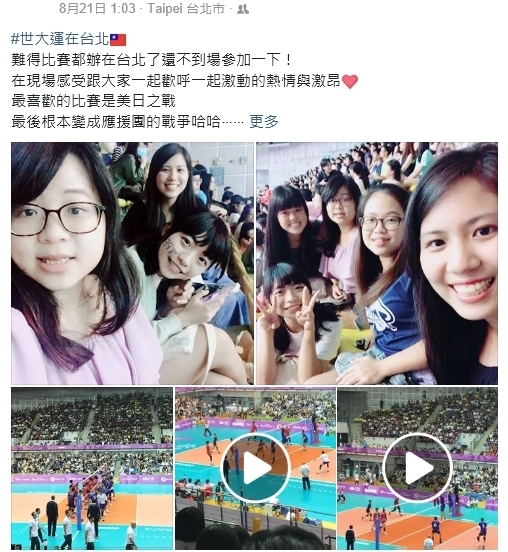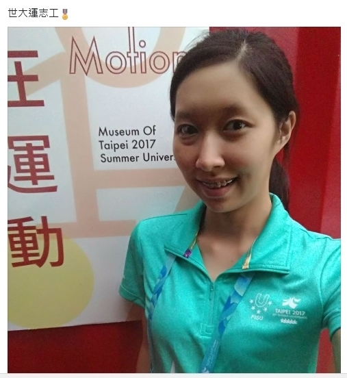 大一的學妹高中時就報了名參加(世大運)志工,世大運開賽期間仍購票入場,非常『有情且熱情』地在現場為我中華隊加油;完訓後不忘『志願服務』之情,更是不容易!