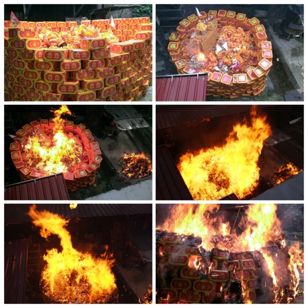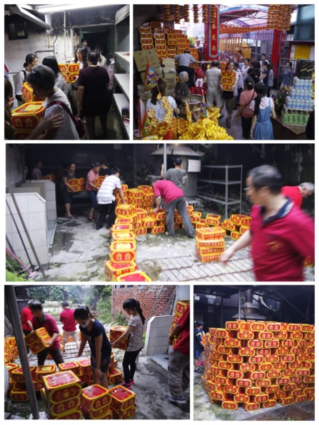 法師宣經禮畢,合會的善信大德一起幫忙堆疊金紙,準備燒化金銀財寶儀式。