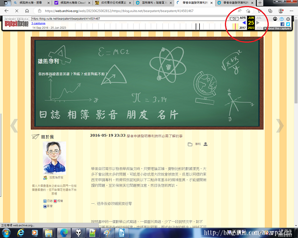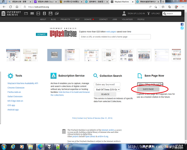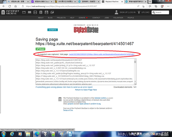 備份完成後網站會出現一個可以點選的網址,用滑鼠點擊它,看看網站是否成功地完成備份這個網址。 這個動作一定不能少,因為筆者當時可能一口氣備份太多文章網址,所以有些文章網址頁面點擊後被回報說沒有被備份,讓人等一下或是隔天再備份。 若是成功備份則會出現如下的頁面,完成備份的工作。