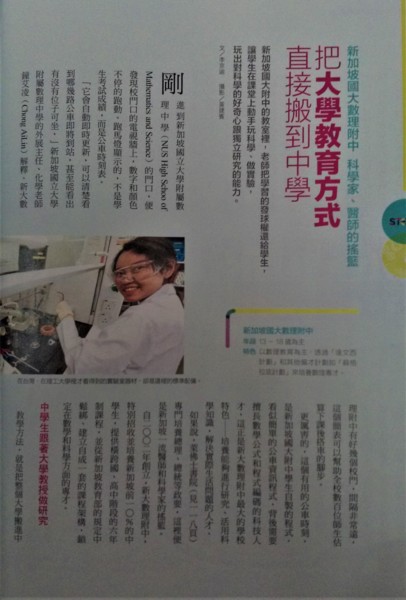 新加坡國立大學附屬理工中學的物理老師林佳慧(Lim Jia Huei)說:「科學,不是拿來背誦或考試,而是培養孩子成為解決問題、甚至問對問題的人。」她的物理課裡沒有課本,教材是生活隨處可見的音響、洗衣機的水管等,她說:「老師主要在做的就是,不斷的問他們『為什麼』,引導他們做更深層的思考。」