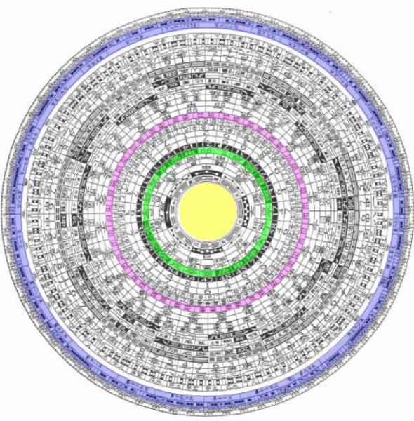 「一百二十分金」: 正針二十四山以下,每山之下分五等分,總計一百二十分金,每一分金占羅盤的三度角。一百二十分金只標注四十八個分金,其餘分金的位置是空的。這是因為丙丁庚辛分金是屬於旺相分金。空位上的是屬於孤虛、煞曜、差錯、空亡分金,棄之不用。 下圖為羅經,由內向外:黃色部份是天池,綠色部份是正針二十四山,粉紅色部份是一百二十分金,藍色部份是二十八星宿及吉度角。