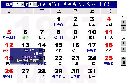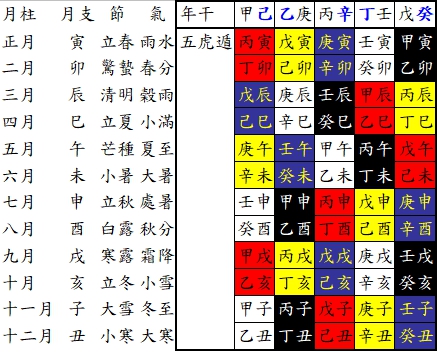 擇吉日吉時之法則。 Ans: 擇吉日吉時需把握四個基本的原則:1. 過立春換年,2. 過二十四節氣的”節”換月,3. 過晚上零時換日,4. 過整時換時。舉例說明:通常立春在國曆的二月四日或五日,若是農曆正月初一在立春之前,按太陽曆該日屬前一年的十二月,還未換年。過節換月指過正月的立春才是正月(寅月),過二月的驚蟄才是二月,以此類推…。過晚上零時換日,子時是從晚上十一時到凌晨一時,因此晚上十一時到零時是當日的「晚子時」,零時到凌晨一時是新一日的「早子時」。 八字排法。 Ans:八字包含年柱、月柱、日柱、時柱,分別以天干地支表示。其排法之基本原則也是依1. 過立春換年,2. 過二十四節氣的”節”換月,3. 過晚上零時換日,4. 過整時換時。 我以下面的例子說明八字排法:某男民國五十六年三月十三日卯時生。 1年柱排法: 民國五十六年為丁未年,三月十三日已過丁未年卯月(驚蟄),所以確定年柱為「丁未」。 2月柱排法: 三月十三日已過丁未年卯月(驚蟄),再用萬年曆或五虎遁法,由年干得出月干即為「癸卯」。 3日柱排法:查萬年曆得「丙子」。 4時柱排法: 時柱之時干,從五鼠遁法由日干得出「辛卯」。 因此某男八字即得: 「丁未」「癸卯」「丙子」「辛卯」。 天干、地支、六十甲子、二十四節氣、十二時辰、萬年曆、五虎遁法、五鼠遁法列於後供參考 天干:甲、乙、丙、丁、戊、己、庚、辛、壬、癸,陽干為甲丙戊庚壬,陰干為乙丁己辛癸。 地支:子、丑、寅、卯、辰、巳、午、未、申、酉、戌、亥 鼠、牛、虎、兔、龍、蛇、馬、羊、猴、雞、狗、豬,陽支為子寅辰午申戌,陰支為丑卯巳未酉亥 六十甲子:原則為陽干配陽支、陰干配陰支,組成六十甲子