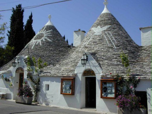 也就是名列世界遺產之ㄧ的地方~ 義大利南部小鎮~Alberobello((綠樹鎮)) 這個地方有何特別之處呢?? 其實最特別的地方就是當地的住屋(Trulli) ((我們一群人都說這是叫禿驢屋因為發音粉像)) Alberobello大致上建於十五世紀~ 自義大利文直接翻譯為"綠樹~" 由於這兒雨水及大雪凶悍~ 所以將屋頂築起像魚鱗般斜斜的圓錐狀~ 可以減輕當地雨水及大雪的傷害~ 住在這裡的農民~沒有所謂巿民的身分~ 可以被地主自由買賣~所以被稱之為農奴~ 而這些農奴都是居住在這個號稱Trulli的屋子~ 十七世紀開始有所謂Trulli尖塔狀小屋頂興起~ Trulli尖塔狀小屋群聚的由來~ 是當時當權的伯爵們允許這些小屋有免稅權~ 所以當地農民一堆人便把屋頂弄得尖尖的來逃稅~ 慢慢的就成了一個充滿當地色彩的小鎮~ ******************************** Alberobello的一些特產為橄欖油、葡萄酒等~ 因為南歐天氣的關係~ 所以產出來的葡萄酒甘醇不酸不澀,口感很均勻~ 淋上橄欖油及香料的小餅乾,酥脆帶著陣陣麥香~ 也算是頗具地方特色的一個小名產~ 當地的生菜更是一絕~ 因為所有的生菜都是自種~ 淋上橄欖油加上一點鹽巴~ 說真的~香脆甘甜~~ 配上當地所烤出來的羊肉及香腸~ 一口葡萄酒~一口烤羊肉~佐配著生起士~ 整個南歐食材風味全融入口中~ 讓我不得不去特別推薦這個地方~ 不過我到現在依舊想不透的~ 為何這個地方所烤出來的羊肉~ 卻一點腥味都沒有~加上肉上有迷迭香佐伴著~ 害我一邊寫著~口水又一邊吞著~ ****************************************** 若是大家對這個地方有特別興趣的話~ 可以連上網路去搜尋~Alberobello~ 這樣就可以連到義大利的專屬網頁~ 可以瀏覽一下這個地方超美的照片~ 尤其是冬天下雪的時候~ 一片雪白覆蓋在這尖塔狀的屋頂~ 自屋內透出淡淡鵝黃的燈光~ 遠遠挑望著~有如童話般的美麗~ 強力推薦這個地方~Alberobello~~~ |