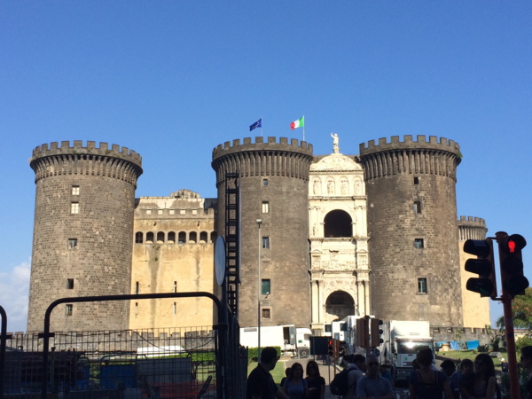 岸邊 巨大暗黑的Castel Nuovo城堡聳立在前方