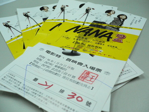 好久沒這麼趕著去看一場電影,在開了四小時的會議後,我一刻也不想留念的關了電腦迅速離開公司。上了捷運心想要坐一段時間,於是翻開包包想拿出一本書出來看,卻發現我背包空無一本書…。其實我很喜歡坐大眾運輸工具,無論是公車、捷運、火車,因為只要坐上去我就有多餘的時間拿來看書,所以我的背包裡常會有著一本書,現在怎麼沒了?因為現在公司離家很近,只有一站捷運的距離,似乎不到10分鐘的車程,看書也看的不過癮。小喬問我說要不要看NANA2她有多一張票,我說好啊!第一集去年有看過不難看,看看第二集多出啥花樣。有一段時間沒來西門町看電影,我出了捷運站,看到人潮依然是這麼多,時間緊迫,沒多看看四周圍有啥新變化,直奔戲院去。小喬一見到我,馬上叫我在外頭等著凱西,她先進戲院上廁所,我拿過小喬給我的電影票,眼睛馬上被票上的印章所吸引,媽呀!這不是我前前公司董事長的印章,怎會蓋在電影票上,這麼有趣的票一定要留著。接著凱西出現,我把票交給她,她給我一張CD,她等著小哇,換我進了戲院,有種接力賽的感覺…。