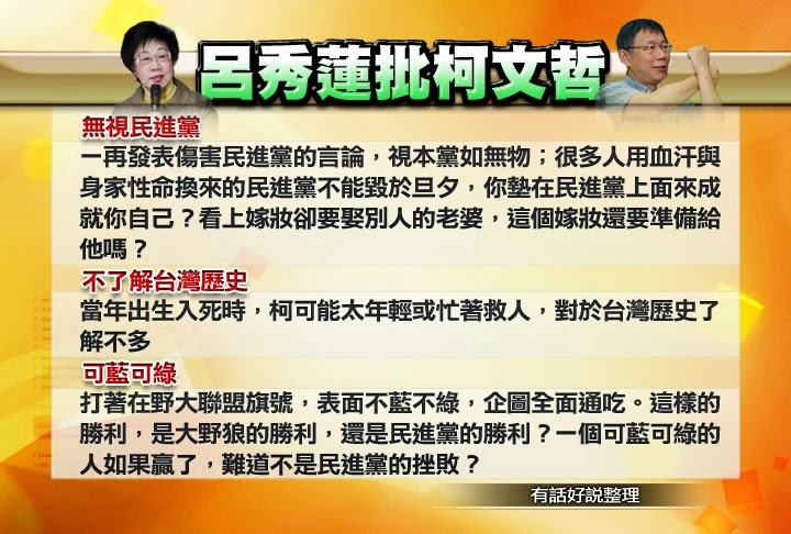 ◎呂批綠迷戀柯文哲是失敗主義 @@呂是「自我迷戀」重症患者。 http://blog.udn.com/buapiiam/11183525 柯文哲 38.9% ◎祖母綠出征 呂秀蓮宣布選北市長 @@怎麼看都覺得呂已時不我予!http://classic-blog.udn.com/buapiiam/9205940 ◎呂嬤沒賣點,不惜「討罵」搏版面→呂秀蓮說民進黨成就柯P 鄉民:別往臉上貼金 http://classic-blog.udn.com/buapiiam/22587154 ◎柯文哲大勝25萬票 呂秀蓮酸:集體造神魔術棒 @@呂秀蓮切勿使自已變成惡綠夜叉 ! http://classic-blog.udn.com/buapiiam/19435177